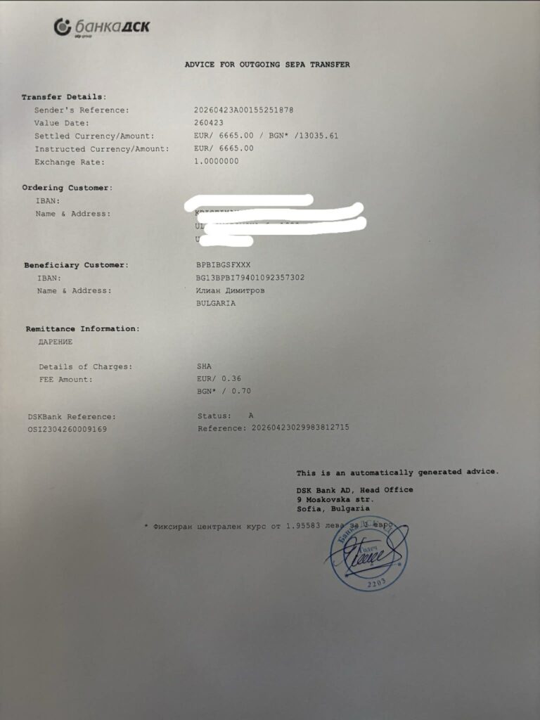 Прилагаме платежното за преведената днес сума от 6 665 евро: